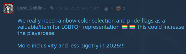 >>730793156unironically I will not even bother using steam forums nowclown reacting to freaks and retarded developers was the only reason I used them