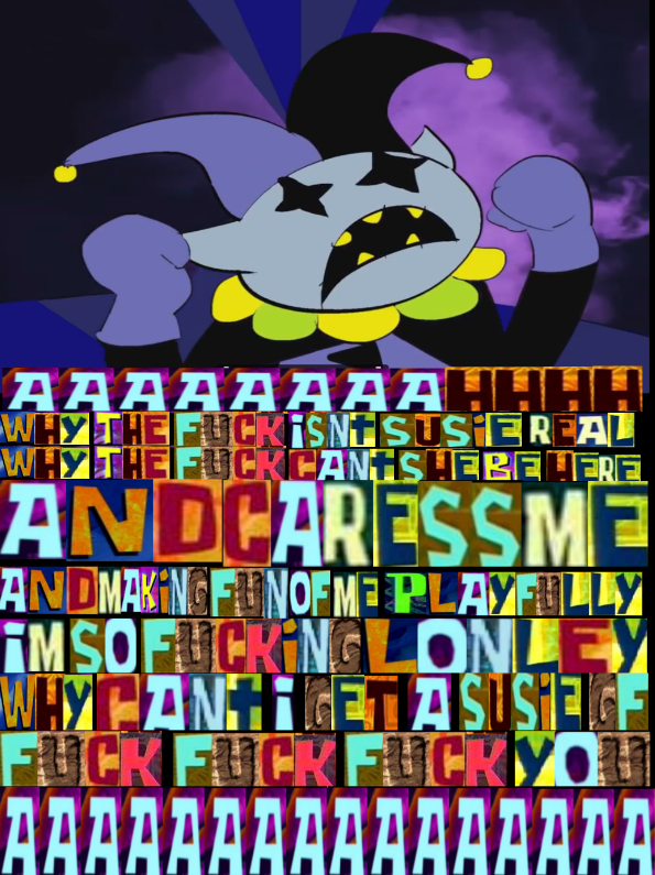 >>730811287>Jevil" didn't exist until the Dark World was created by the KnightDarkners somehow exist and somehow do stuff even before the fountains thats how Spamton and Jevil know each other