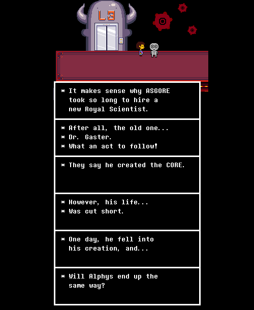 >>730808342>Your argument is getting too much into headcanon materialI suppose but I 100% believe that in the end, Gaster will be used to make some sort of statement about the player's behaviour in the same way Flowey was a commentary on predicting the mentality behind neutral-pacifist-genocide players.The specifics of it aren't clear but it'd be a waste not to do that in some form or other considering that flowey moment was the most genius thing about UT