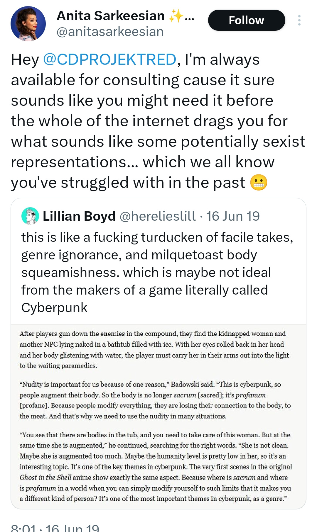 >>730799101>People /here/ never bothered to actually read what she was sayingYeah chuddie, don't believe your memories, there were no lies, no stolen footage, no massive censorship for anyone that pointed out her lies, all video game journalists didn't release "gamers are dead" hit pieces the same week, their coordination group chat didn't get leaked. Just forget that all of this happened and that Anita promoted exactly the same shit she is attacking right now.