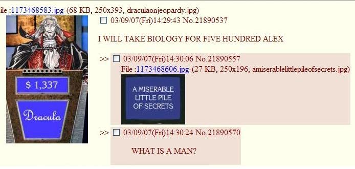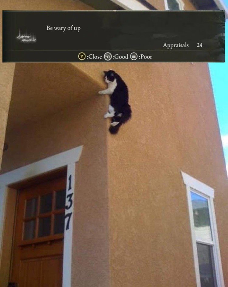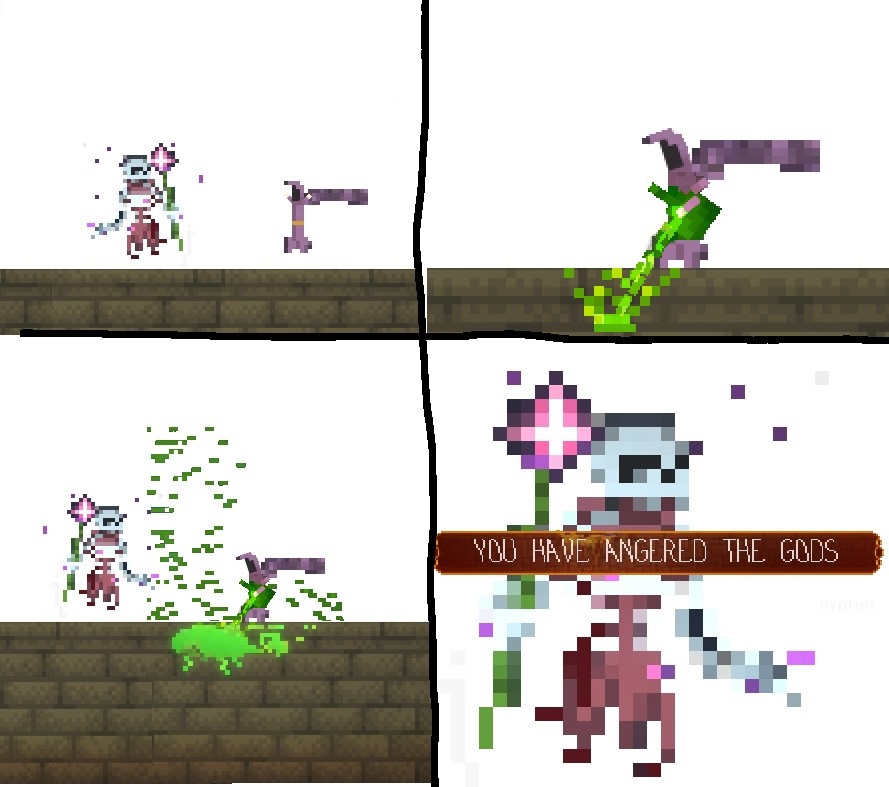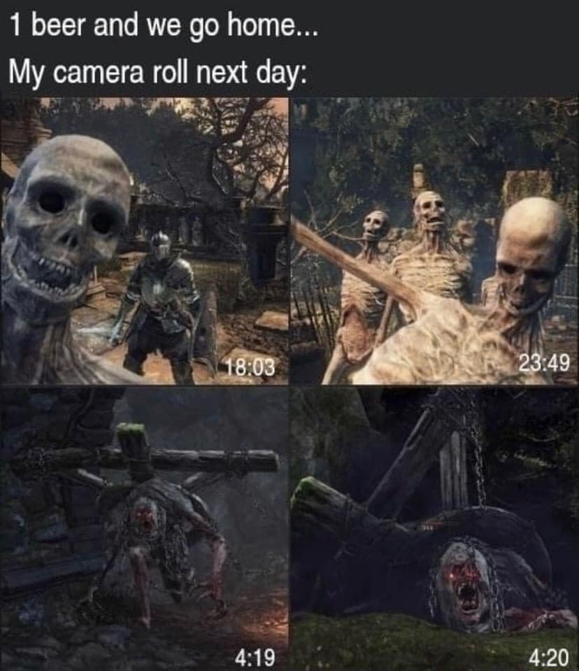 >>730802019>>>730799134(OP)>I don't get it.Its pretty self explanatory, he forgot the Furtive Pygmy, who is easily forgotten. This quote appears in Dark Souls 1 >>>730799413>I don't get it.Its a reference to how Dark Souls has a very vague lore, and how common it is for a Boss in the middle of a fight have a cutscene where they remember a loved one and get a powerup>>>730799632>I don't get it.It is a reference to an old comic where a character shows another how hard they can pee. However it is remade in the game Noita, with the Main Character using an Acid Potion to melt alway the floor of a Sacred Ground, which leads to the "you have angered the gods" message.>>>730799670>I don't get it.The character says "You do not look like law", since he is a criminal and would have attacked a cop if the Main Character was one. However, since it is a more primitive playstation 2 game, he can no acknowledge the fact that the player put on a cop custume for the Main Character.
