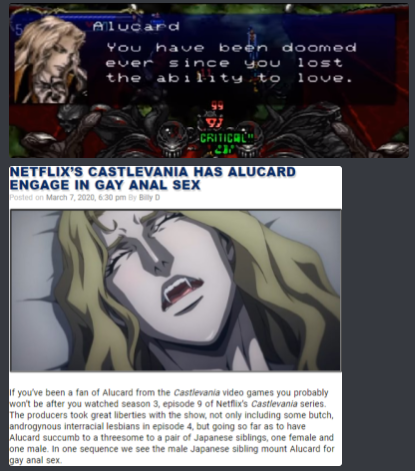 >>730800278I remember hearing about this for the first time and my first thought wasn't "they made alucard gay?" but >why is there even a sex scene in castlevaniaAnd I still think it's weird, why is this cartoon based on a video game for the nes adding orgies to the story