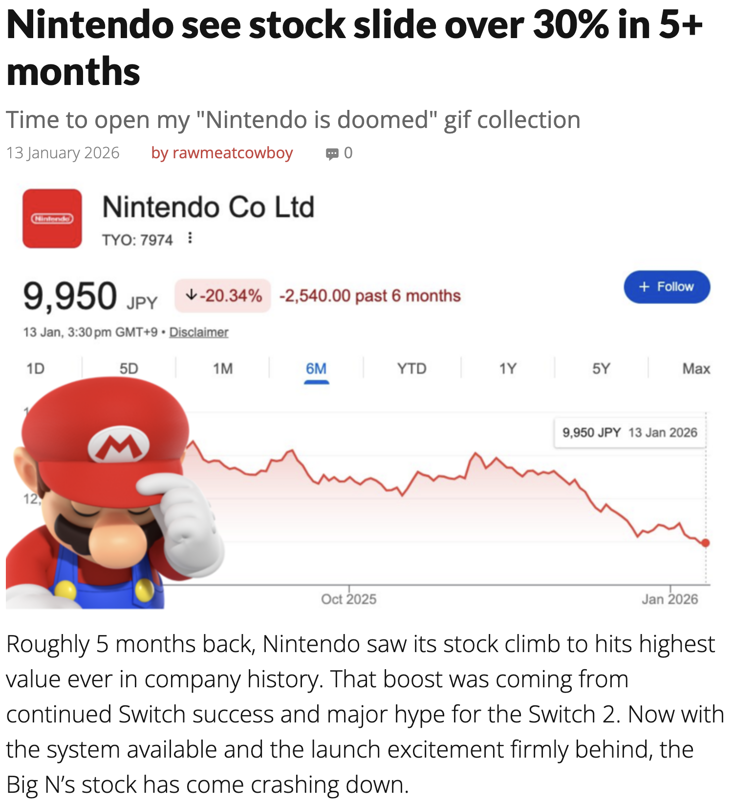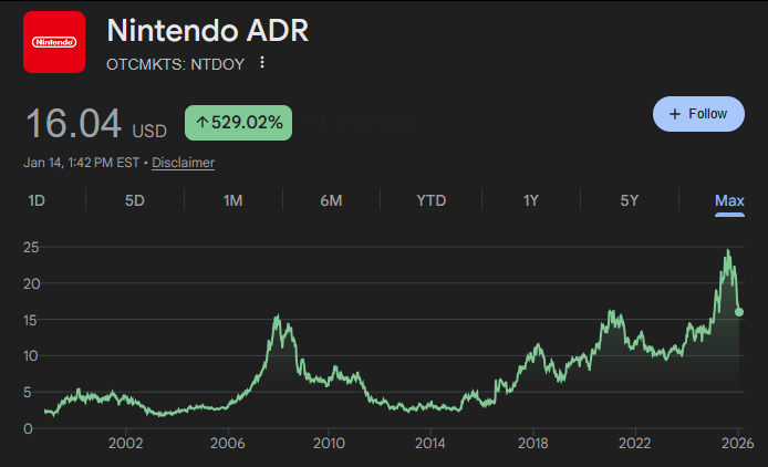 >down after being at an all time high>Still up 9% over the past yearGreat time to buy, thanks for letting me know OP. I paid for my switch 2 entirely from Nintendo stock dividends.