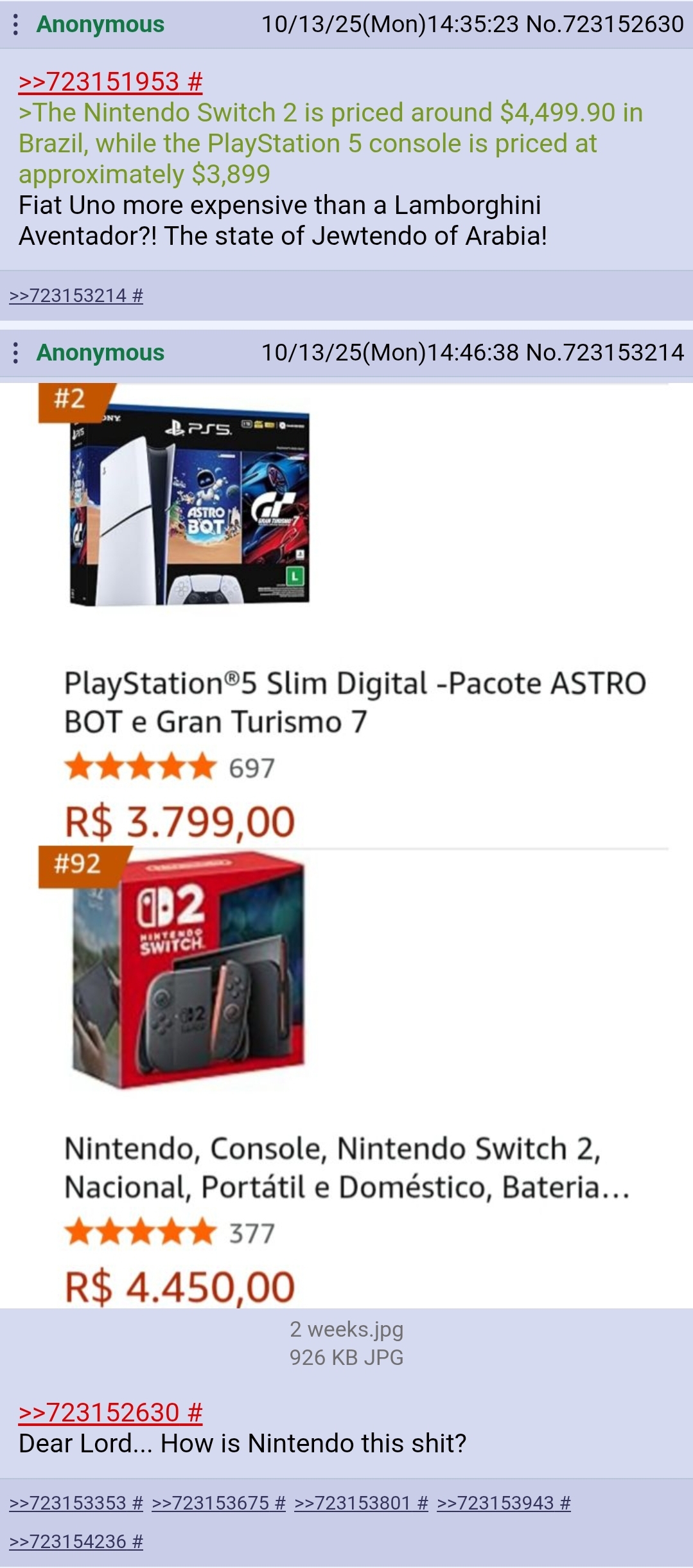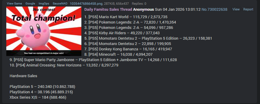 >fearmonger about nintendo censoring games>NoJ promotes even outright ecchi games that would be pushing the line on the vita>snoy puts out an AI censorship patent, valve starts banning more random anime games for no reason>fearmonger about nintendo raising the prices>nintendo's costs stay steady and even on muttland only the price of accessories and the older switch 1s raise a bit>valve discontinues the cheapest goydeck, it is now more expensive than the switch 2, snoy also lowers the capacity on their factory ssds to nearly half>fearmonger about nintendo stocks droppingare you sure you want to continue with that dogshit karma of yours?