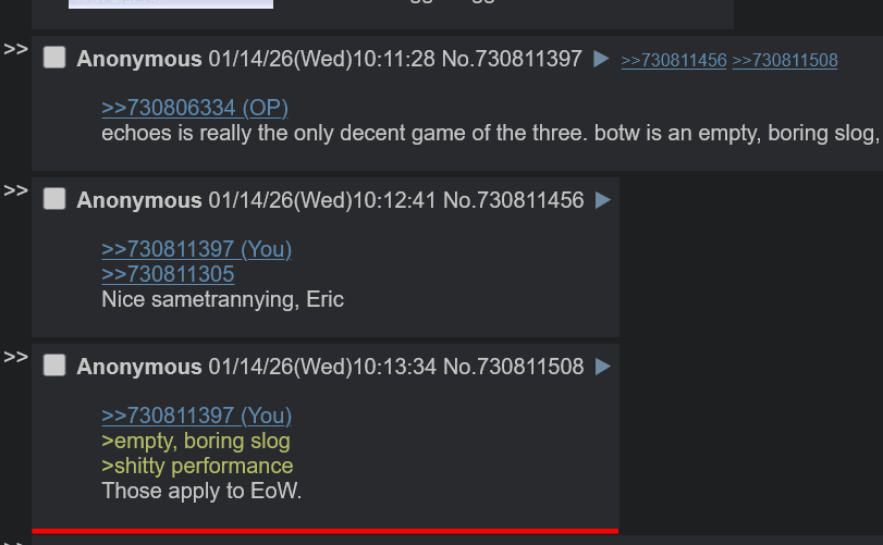 >>730806334>BotWGood proof of concept, but barren and strayed too far from the series' roots. New items never feel meaningful, dungeons are a joke and all look the same.>TotKBotW gmod dlc as a standalone $70 game. Dungeons and bosses visually improved but largely worse due to the sheer number of one-size-fits-all solutions that problems rarely attempt to restrict.>EoWA good step back towards classic Zelda. Unfortunately also has the TotK problem of being immediately handed a dozen blocks that all fit in the square hole, which doesn't leave me feeling confident that dungeon design will ever be good again in the series.