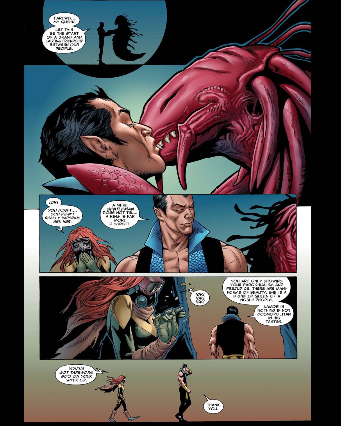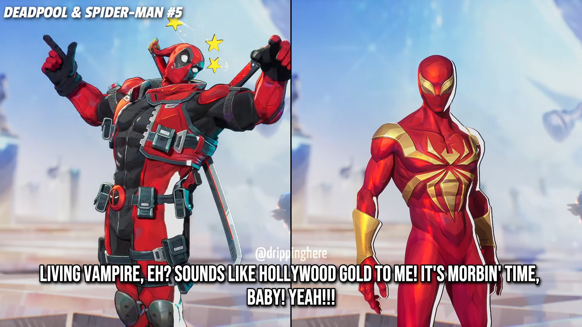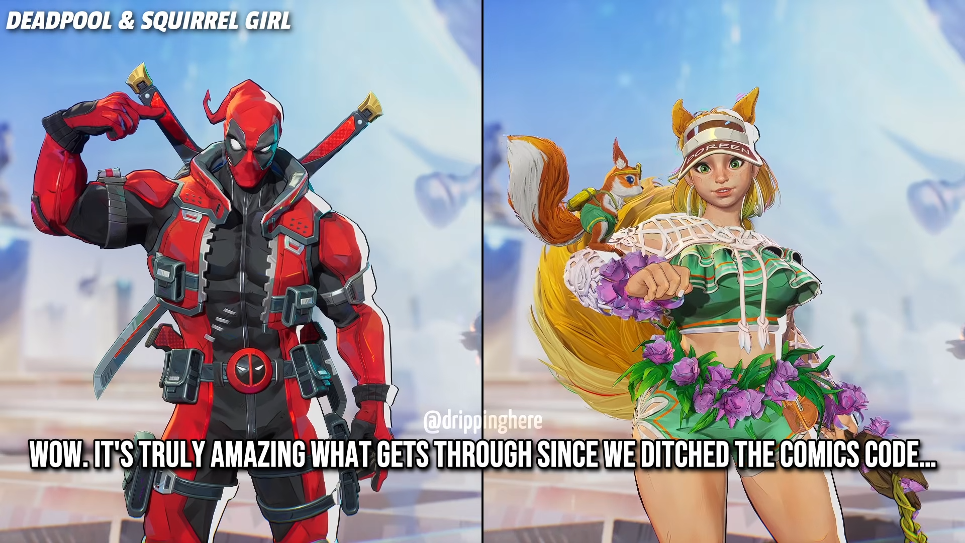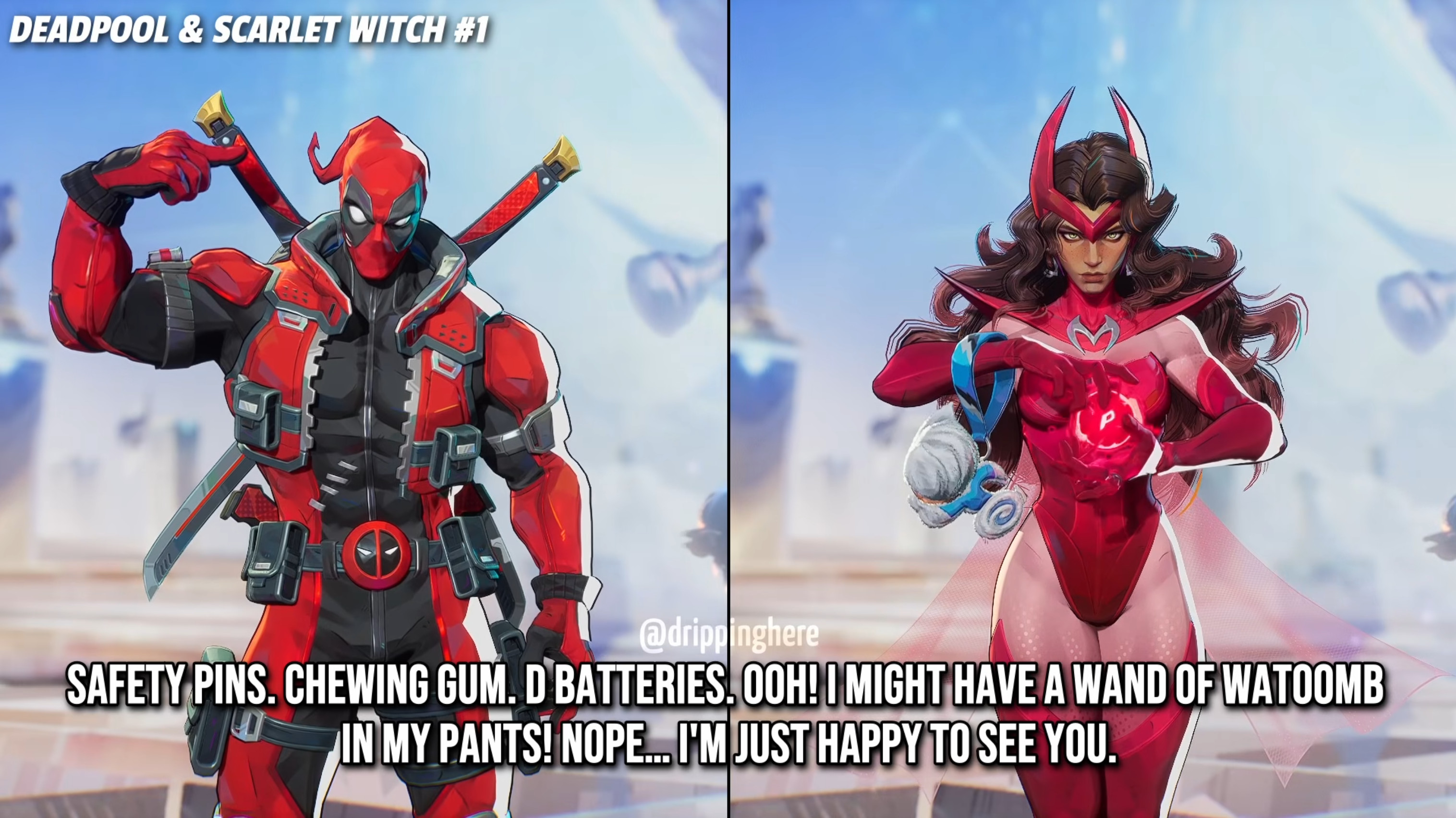 >>730811257>Deadpool calls Hawkeye "hawk-tuah">Makes fun of squirrel Girl for saying "She eats nuts" in her catchphrase and laments how shameless comics are now>Hela finds him attractive>Asks Penny if her robot is a baby Gundam or an Eva Unit>Asks Mr Fantastic if he can make his dick bigger at will>Tells mantis his dick gets green>Literally says "he is full mast" after killing Capt America>Apparently him and Rogue dated for a while and he says they used to knot tonguesI like they didn't puss out that much, I was expecting PG kiddy pool
