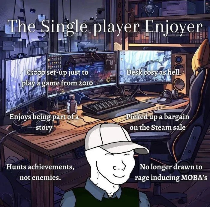 No I'm just old. I'm 35 and my days of MW2 and CS are over. I don't have it in me to stay up until 4AM drinking with friends. 95% of my gaming is single player horror, 4% is shit like L4D, DBD or some other multiplayer horror and the rest is whatever looks good.That pic is literally me but 2 monitors and a 4070ti Super/R9 9700X3D build so I don't think it was $3,000 but its very cozy