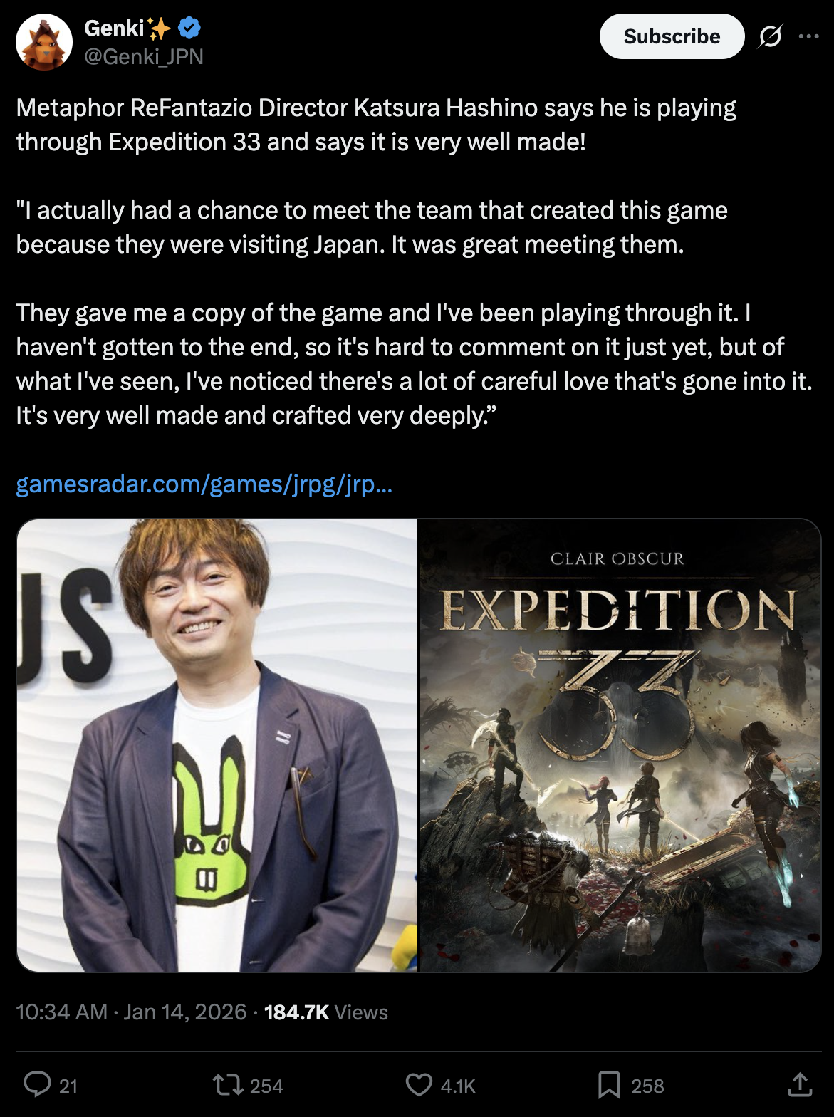 >FFVII remake devs congratulate Expedition 33 devs, even they met in real life>Now the metaphor devs do the sameMeanwhile Yoshi-P didn't say a single word about them