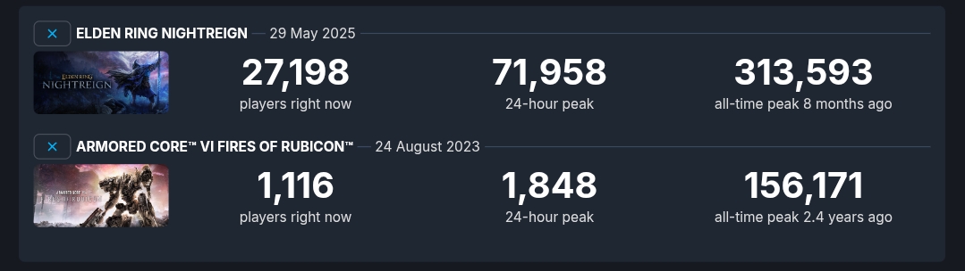 >>730815348>game from 8 months ago predicated on massive success from previous game that got updates vs single player game that got ONE update in it's 3 year shelf life so farThis doesn't prove anything except consumers are sheep.