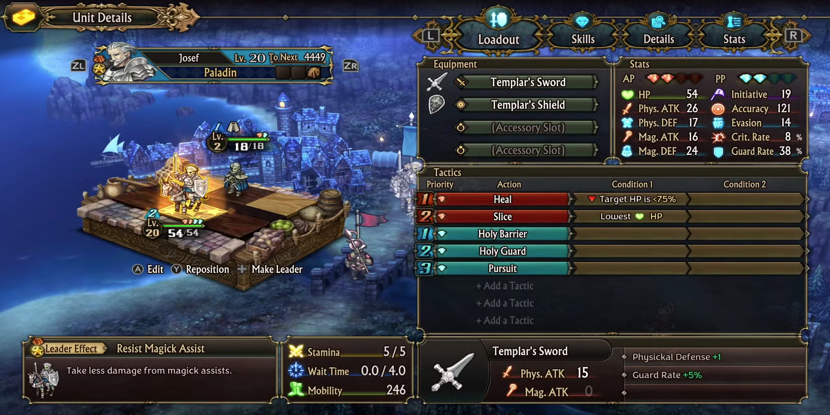 >>730824979>>730825219Here's an example with a little bit more detail.This is Josef, an early-game crutch character. He's a cavalry unit with both offensive and supporting skills, and he innately has 2 AP (Action Points) and 2 PP (Passive Points). When his turn in battle comes around (based on Initiative), he'll choose an AP skill (the ones colored red) to use.From this example, his highest-priority skill is Heal; but he's set to only use it if one of his squad members has less than 75% HP. If all of his allies have more than 75% HP, he'll instead spend his AP on Slice, and it will target the enemy with the lowest HP.The blue PP-based skills will activate automatically, in response to other units' actions in battle. Holy Barrier, for example, reduces the damage an ally will take, while Pursuit will allow Josef to perform an additional attack against an enemy just hit by an ally. However, with only 2 PP to use, it's possible that Josef will spend all his PP on things you don't really care about (for example, reducing the damage of weak attacks from fast foes).In this case, you can set conditions on these Passives as well, like, say, "Only when Allies are below 50% HP" for Holy Barrier.There's a good amount of complexity to it, especially as you shuffle individual units between squads to get the most out of synergies between them.