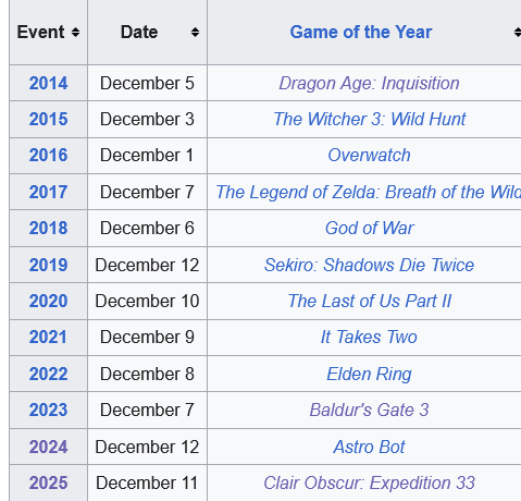 >>730834080It would 100% lose to these games>2017 December 7 The Legend of Zelda: Breath of the Wild>2019 December 12 Sekiro: Shadows Die Twice>2022 December 8 Elden Ring>2023 December 7 Baldur's Gate 3And it would lose to this game because of judges>2020 December 10 The Last of Us Part II