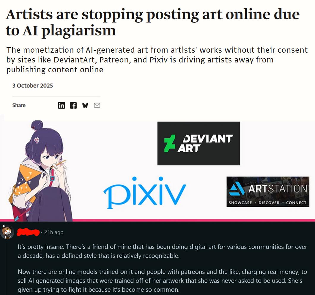 Artists sold out, putting everything on social media, boosting it, pushing awful fetishes for money and now they're being harvested for data and they can't be satisfied that they got their free lunch because they've devolved into economic parasites. I only wish AI could hurt them more.
