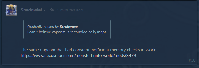 >>730846429>What the actual FUCK happened to the people who developed world?World has a mod to remove constant memory checks that are happening during runtime.https://www.nexusmods.com/monsterhunterworld/mods/3473