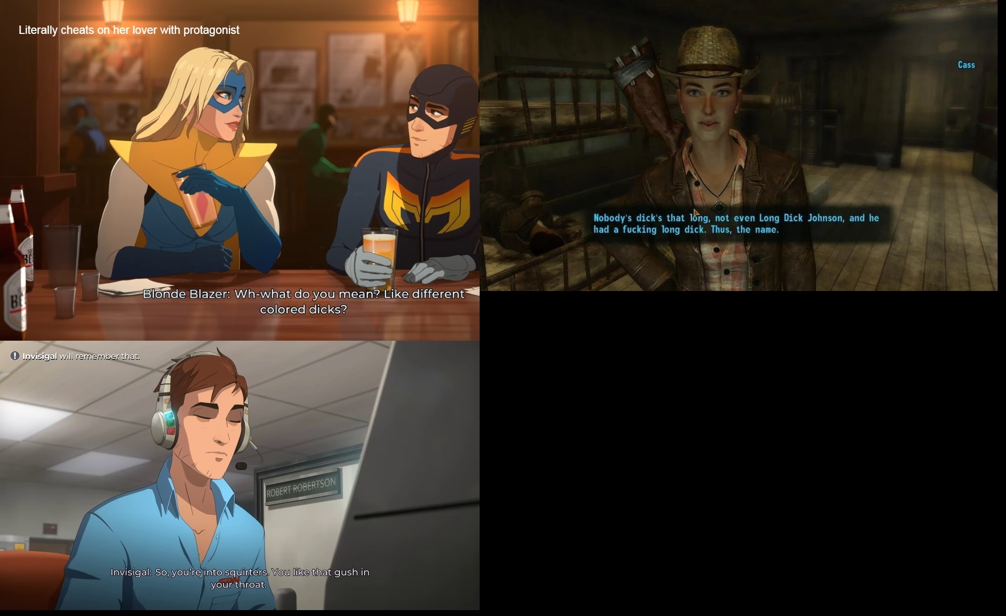 >>730848950The quality of Fallout is leagues above most content being made. Not all, but most. So she didn't even need to say that BL stuff. Just saying "this is bad" is enough to ignore them with some 4chan options.
