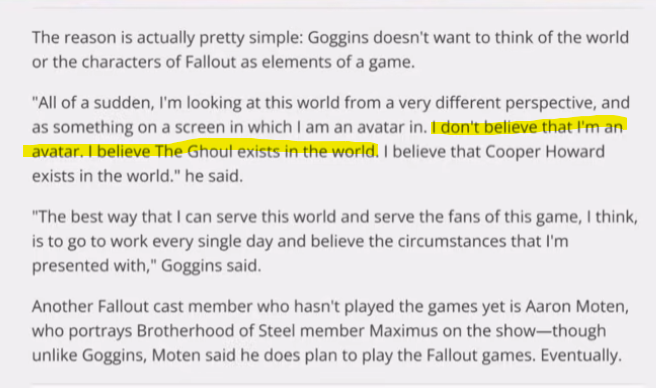 >>730850326There was quite a a bit of levity and dark humor in those games. The show definitely matches the post apocalyptic western dark comedy vibe. Other than the dialogues with the talking heads most of dialogue is in text. And most of the dialogue is expositional. There's really isn't a whole lot of emotion that comes out. Where as dialogue in movies and tv need to come with some sort of delivery.