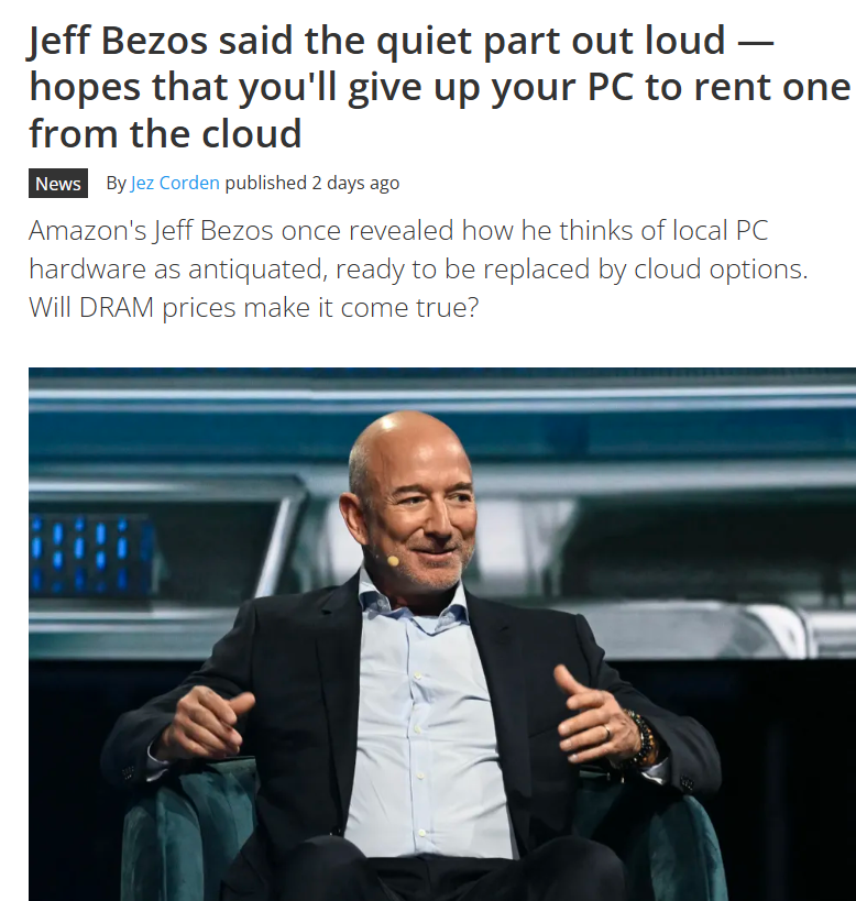 >>730856725There's no real shortage. They're facilitating an artificial shortage to ruin the consumer market, and by 2030 there will be politics in place so that you aren't legally allowed to own a computer above a certain wattage anymore under environmentalist politics. That's why they give people false hope saying it's after 2030 that RAM will return, because what it means is, by then you're technically not allowed to build computers anymore, so the market is ceased. Instead you get government-lent tablets and monitors and have to use Datacenters to use a computer or play games.Larry Fink, the billionaires and politicians are to blame for this.