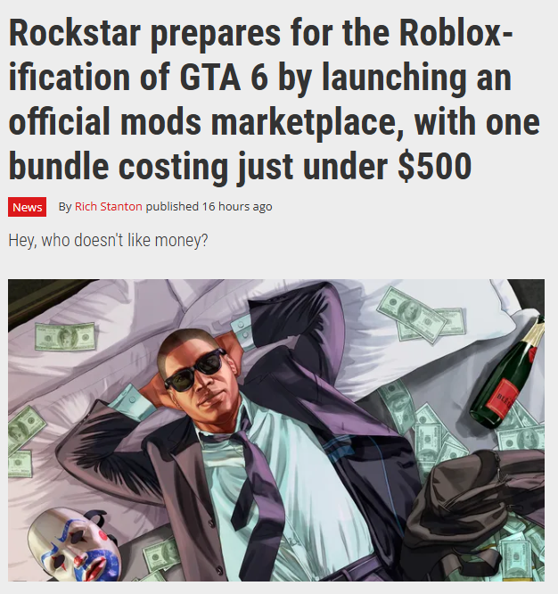>Rockstar has launched an official mods shop, Cfx Marketplace, for "every server and every player" to hand over their lovely loot (thanks, GI.biz). The news comes three years after Rockstar's 2023 acquisition of Cfx.re, a Grand Theft Auto and Red Dead Redemption modding team, which also runs the roleplay servers FiveM and RedM.>If you're thinking "hold on a minute" that's probably because you remember a time when Rockstar and Take Two weren't so happy about modders: Indeed the publisher accused FiveM of hosting code to "facilitate piracy", and banned three of the main creators from Rockstar games.>This policy changed in 2022 as Rockstar eventually woke up to how massive, forward-thinking, and potentially profitable the whole modding and roleplay scene was. It then allowed non-commercial roleplay servers, as long as they didn't interfere with any official services, before moving on to just acquire Cfx.re outright.So Rockstar will just sue every modder who wont sign the official good goy document and make mods for them?