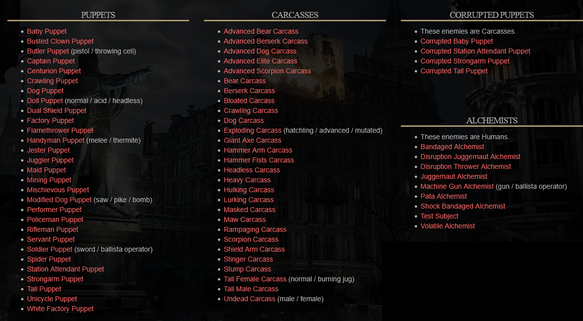 >>730882284I thought that too with Lies of P. I was glad the DLC mixed it up a bit with the zoo animals and the like, but it's a noticeable issue in the basegame. I feel like there's a decent amount of enemies in it still, but a lot of them are just used so sparingly when they could have been used to mix things up more. I don't even think it lacks in enemies, this is a pretty good amount, but it just rarely uses what it has and half the time a more unique and challenging enemy is present it doesn't respawn, so you just end up spending the whole game going up against one basic enemy after another.