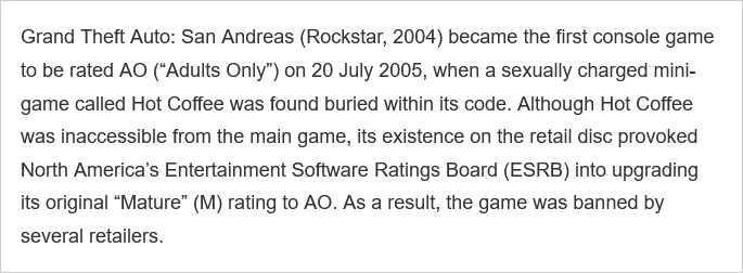 >>730862913an adult only rating was basically a death sentence for video games back then.rockstar had to scramble to remove the hot coffee content from the disk to get it re-re-rated as M.they did get a world record out of it though