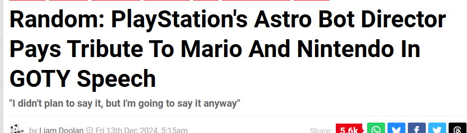Hey Astro's back! Welcome back to the conversation after being ignored. But yes, sales are relevant to a game's cultural impact. By this logic, Call of Duty is more relevant than Mario. This is why Activision is able to release absolute shit like the most recent COD and get away with it. But sales aren't the ONLY means of cultural relevance. There's also public perception. I say the name Mario and any passerby can think of the video game icon, despite being an actual name. Is there any CoD character with that level of relevance? The fans know the big names, but does your dad know? Likely not. This is legacy, which something like Astro Bot sadly doesn't have. I don't hate Astro Bot. Like many, I haven't played Astro Bot. I'm merely pointing out the obvious.