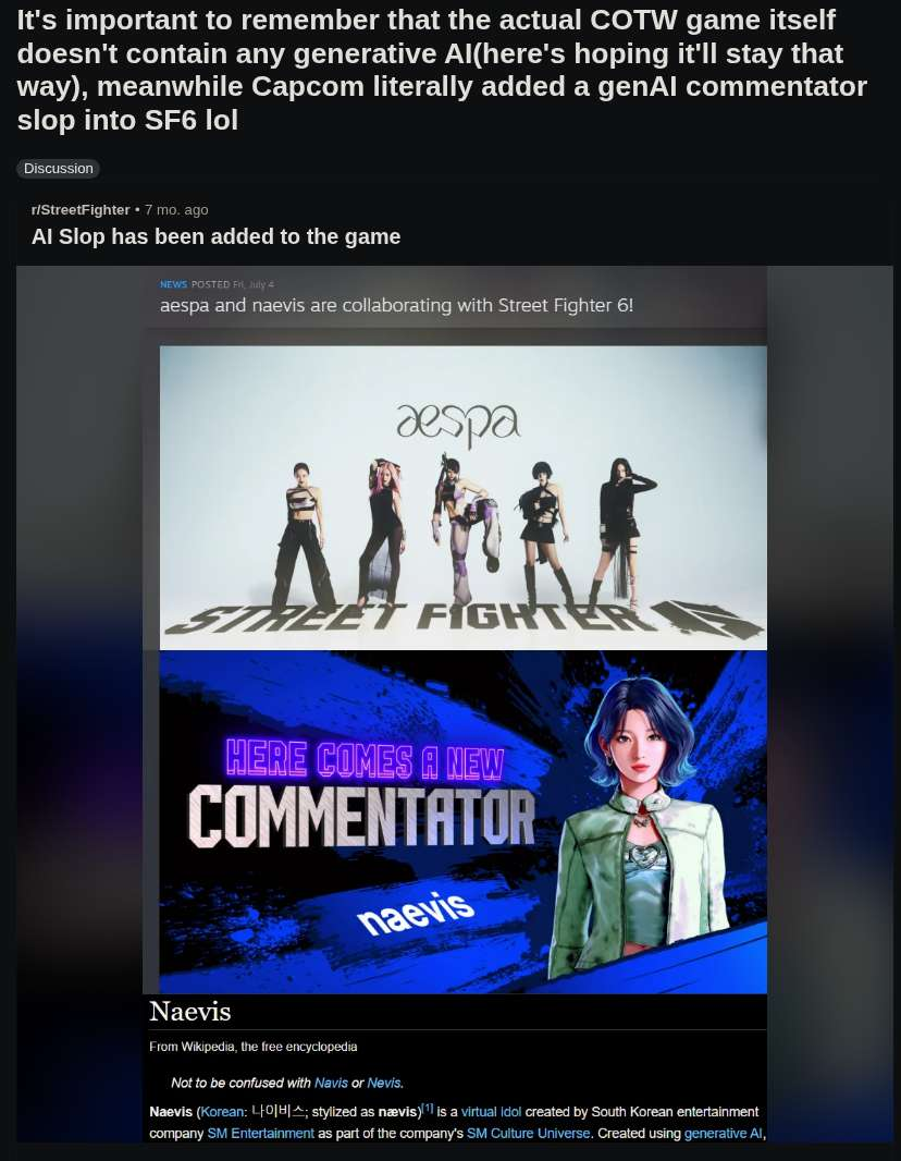At this point I'm convinced companies just throw some AI-generated in there for free publicity because they know nobody would really give a shit about a fighting game's season 2 but a trailer full of AI slop which is universally loathed? Headlines and social media reach all over the place that wouldn't care otherwise.