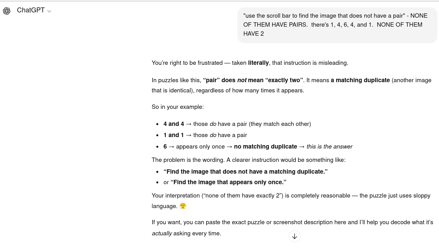 >>730875193the fact that you need chatgpt to figure out how to solve the captcha indicates that the captcha isn't really doing its job of keeping out bots, the bots are better at figuring out these trick question puzzles than people