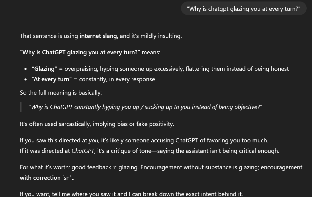Why is ChatGPT glazing you at every turn?"You're right to be frustrated""It's completely reasonable to feel that way"Why did they code it like a helicopter mom?