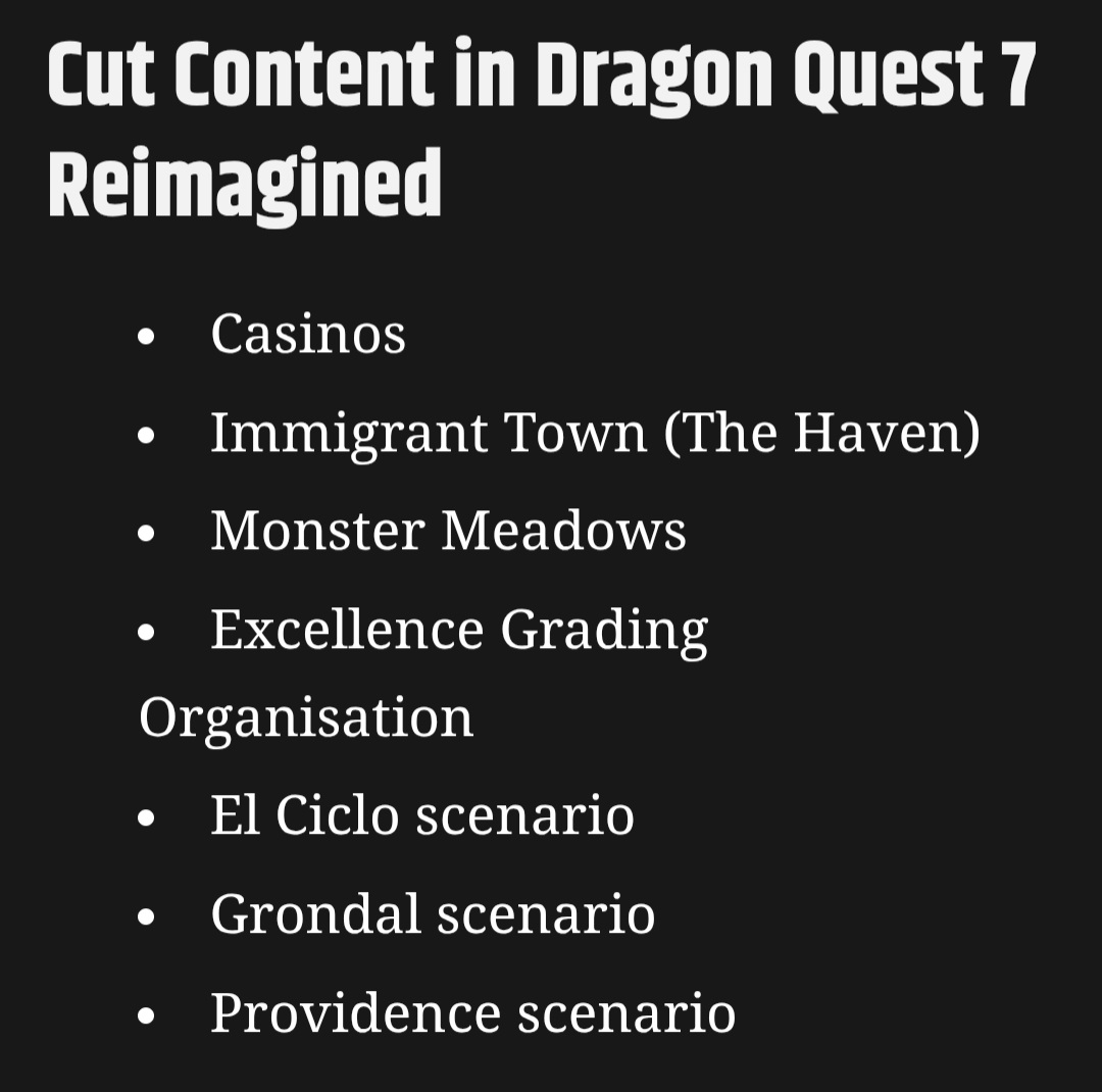 >>730876857Casinos because of CERO/PEGIImmigrant Town idk it wasnt really that good, only really was for tablet job grinding but thats irrelevant because level caps for jobs are goneEGO gone because the island associated with it is gone (El Ciclo)Grondal was literal fillerProvidence is the only real loss fyi theyre adding in new scenarios as well. someone who has a source working on the game says theyre adding more than they are removing