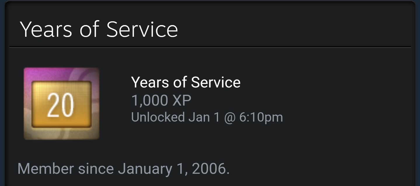 >>730886279I view it as a badge of honorIt's proof that you PLAYED all those years ago, not just that your account had a game registered for that long. It's a show of veterancy and a higher number is better.Don't even fucking talk to me unless your VAC ban is over 10 years old, newfag.