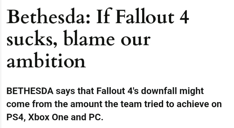 The problem with bethesda is that they still pretend they're a AAA studio while making AA slop. If you stripped "Fallout" and "Bethesda" off of the labels of FO4, it would look like any indie game made by 20 or so Lithuanians. It is that bad. So is starfield.
