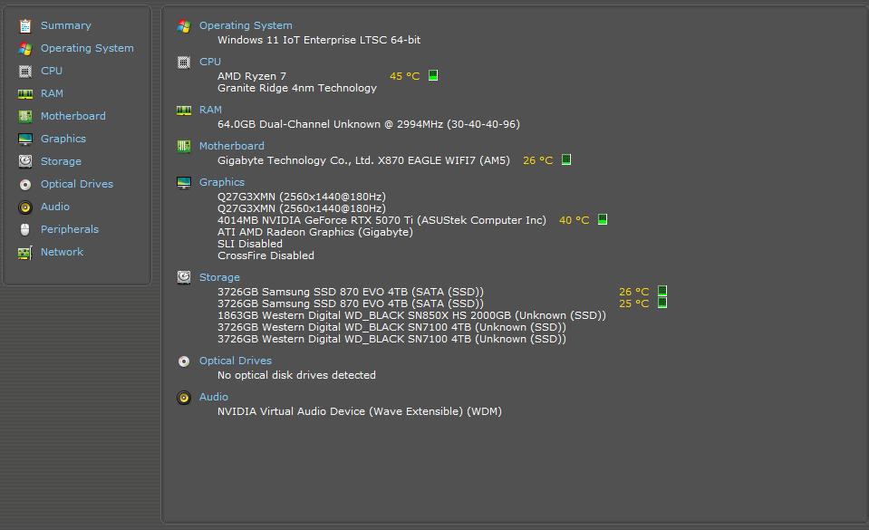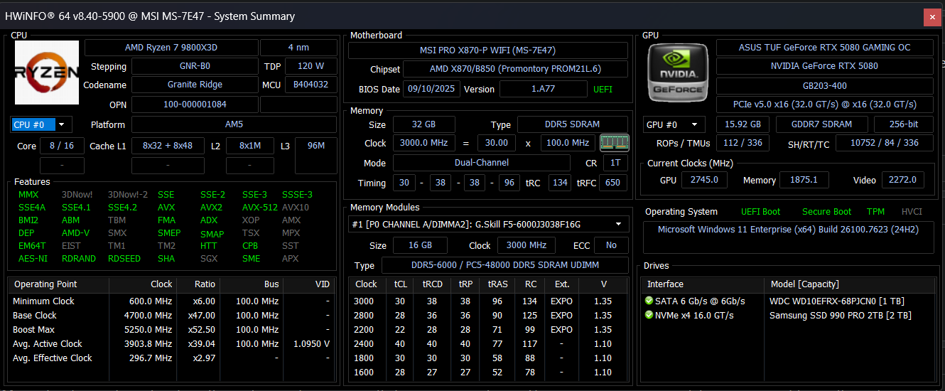 >>730896275Ryzen 9800X3D + 32GB 7400MT CL36RTX 5080I have a samsung 990 1tb + movespeed 1tb + 2tb lexar and 11 external ssds and one 10tb external hdd