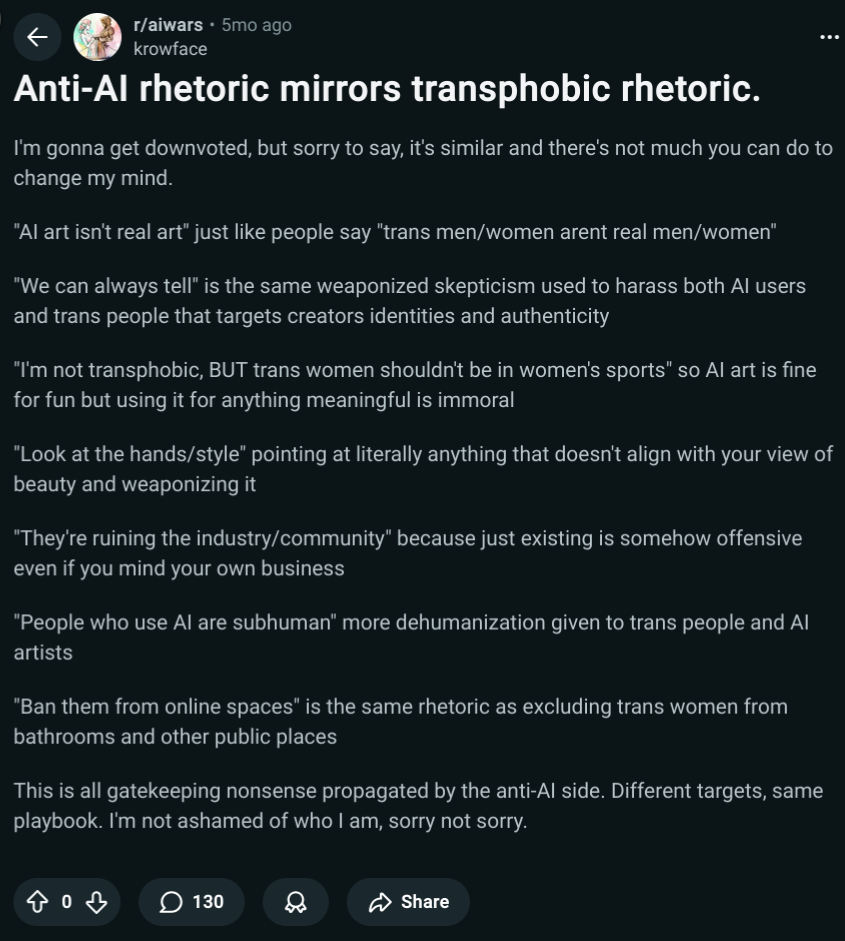 >>730917841All this says to me is that you support AI because you detached yourself from anything it could touch and that anyone still participating deserves what they get.Which means you don't even have a viable opinion in the first place.