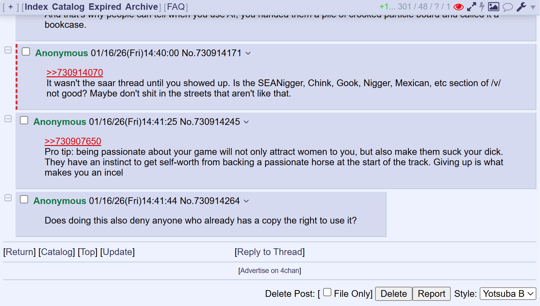>>730907738>I'll gladly look at proof if you have anyasking for proof of things that were posted on 4chan is fucking retarded. most of it gets culled after like two days if not less, and I have nothing to prove, so I'm not going around like a retarded psycho saving every single instance of chatGPT that I see posted here. If you can't identify AI posts, then you're the exact type of retard that they're targeting.
