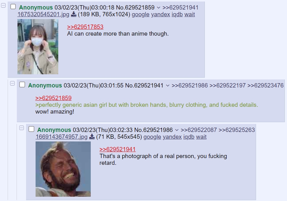 >>730907595Are you trying to say AI posts on 4chan already? I would know if that were occurring. I'll gladly look at proof if you have any, but if not, then consider returning to the filtered section of the board.