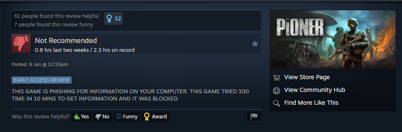 >>730909627>THIS RUSSIAN GAME TRIED TO HACK MY COMPUTERwhy are you posting fake reviews you retarded turd or are you trying to shill the game?