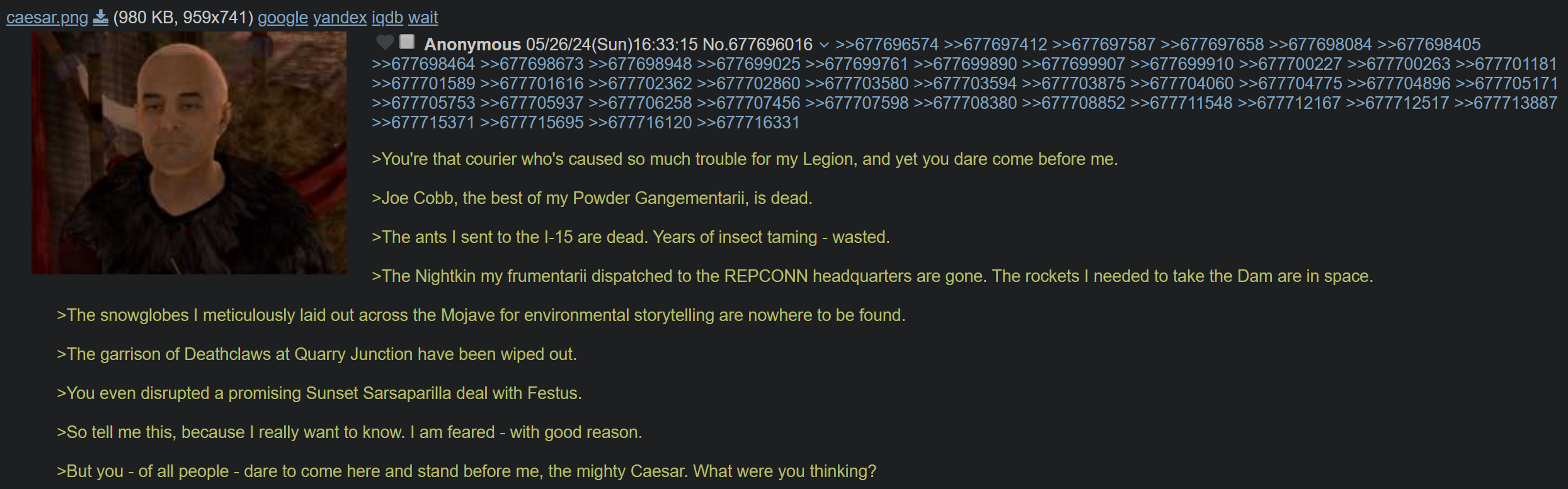 >>730911627Caesar's Legion is pragmatic on the surface level. You have a lawless, broken world full of people who've regressed socially to a point where their superstitions and basest desires command everything they do, excluding a few enclaves miming the trappings of the civilized world that came before.But they're massively outnumbered. Even the English language is lost to most of these new Tribals. How better to put them back on the path to civilization and potentially avoid the folly that ruined the world in the first place, than to recapitulate the second to last empire that dominated the world, that did so under similar circumstances?Edward Sallow was a reasonably well educated NCR citizen who turned to violence, propaganda and authoritarianism as his solution to the combined threats of Raiders, Fiends and Tribals that the NCR were bashing their collective heads against. If you wish to be charitable about his intent, we can assume his ultimate goal was for a Roman-Style Republic to reemerge after all of America was under the Legion. If you don't want to be charitable, Sallow didn't know nearly as much as he thought he did, he pulls misapplied and misunderstood collectivist jargon out of his ass whenever an intelligent outsider calls his bluff. He formed a rag-tag band of thugs, scrapped together the appearance of a coherent philosophy, created a pretense for legitimacy that put midwits behind the 8-ball, and got to propagandizing people whose cultural memory and institutional knowledge had been lost to time. All just to strongarm the remains of civilization. Maybe just to satisfy his own desire to sit atop it all. Maybe because he was actually convinced it was the proper way to reclaim civilization and prevent its old mistakes from being repeated.We can't really know for sure.And that's what makes Caesar's Legion so compelling to discuss, even after 15 years.