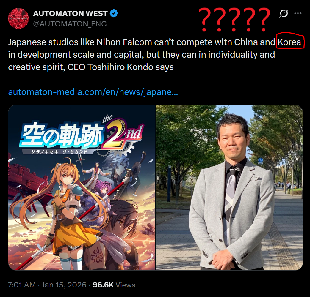 >>730914221Funny because I just read an article where a Korean dev says they can't compete with Japan. All these claims are excuses for one thing: using AI to dev.