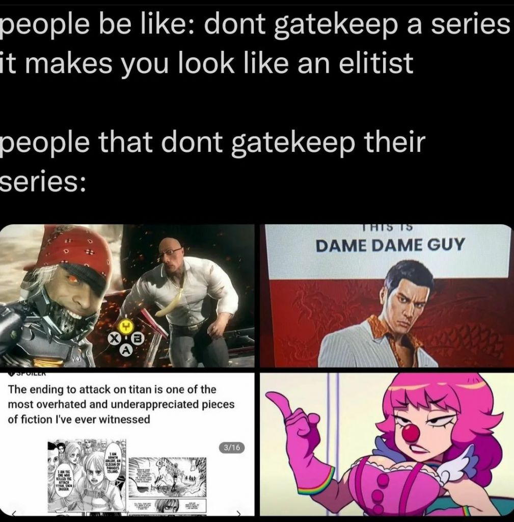 >>730918227Only way to gatekeep games and media is to shut the fuck about them which is the one thing gatekeepers can't do because they gotta brag about their secret club