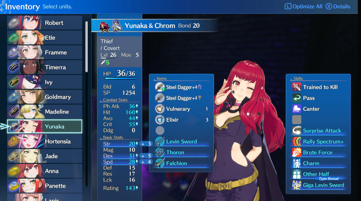 My favorite Yunaka build is making her a sniper, giving her Chrom ring and a forged Killer Bow with Camilla engrave. The only downside is that I miss the thief outfit but its nothing mods cant fix