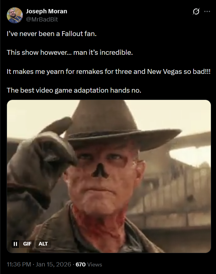 >>730922469Get fucked fallout show is good, it's as good a fallout as 1 which is leagues better than 2 or new vegas.