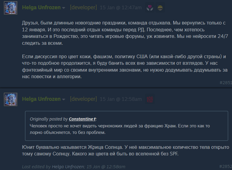 What went so wrong? Why are they so POZZED and LAZY?>Friends, there was a long New Year holiday and the team was resting. We only returned on January 12. And this was the team’s last break before RD. The last thing we wanted to do over Christmas was read gaming forums—sorry about that. We’re not neural networks monitoring everything 24/7.>If discussions about skin color, fascism, U.S. politics (or the politics of any other country), or anything similar continue, I will ban everyone involved regardless of their views. We have a fantasy world with its own internal rules—there’s no need to invent agendas or allegories on our behalf.Someone asked>The person simply doesn’t want to see Black people as part of the Temple faction. If that’s explained by the lore in some way, then no problem.Dev answered>The unit is literally called Priestess of the Sun. She has the maximum amount of her body exposed to that very Sun. So what color is she supposed to be in a universe without SPF?