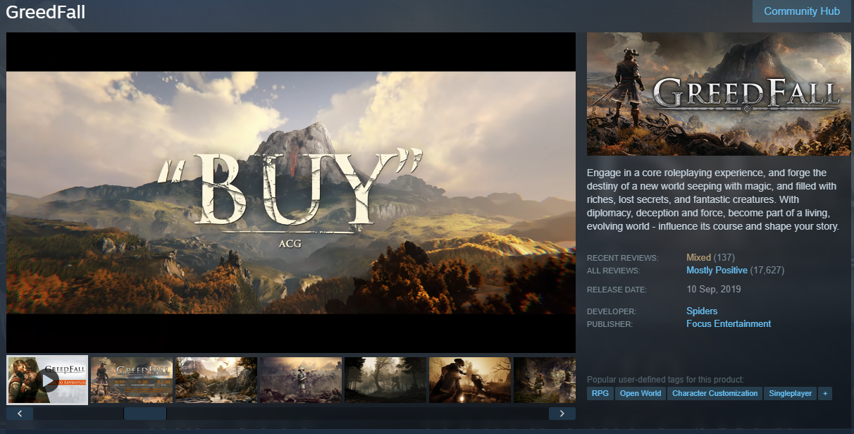 >90% offBuy?https://store.steampowered.com/app/606880/GreedFall/
