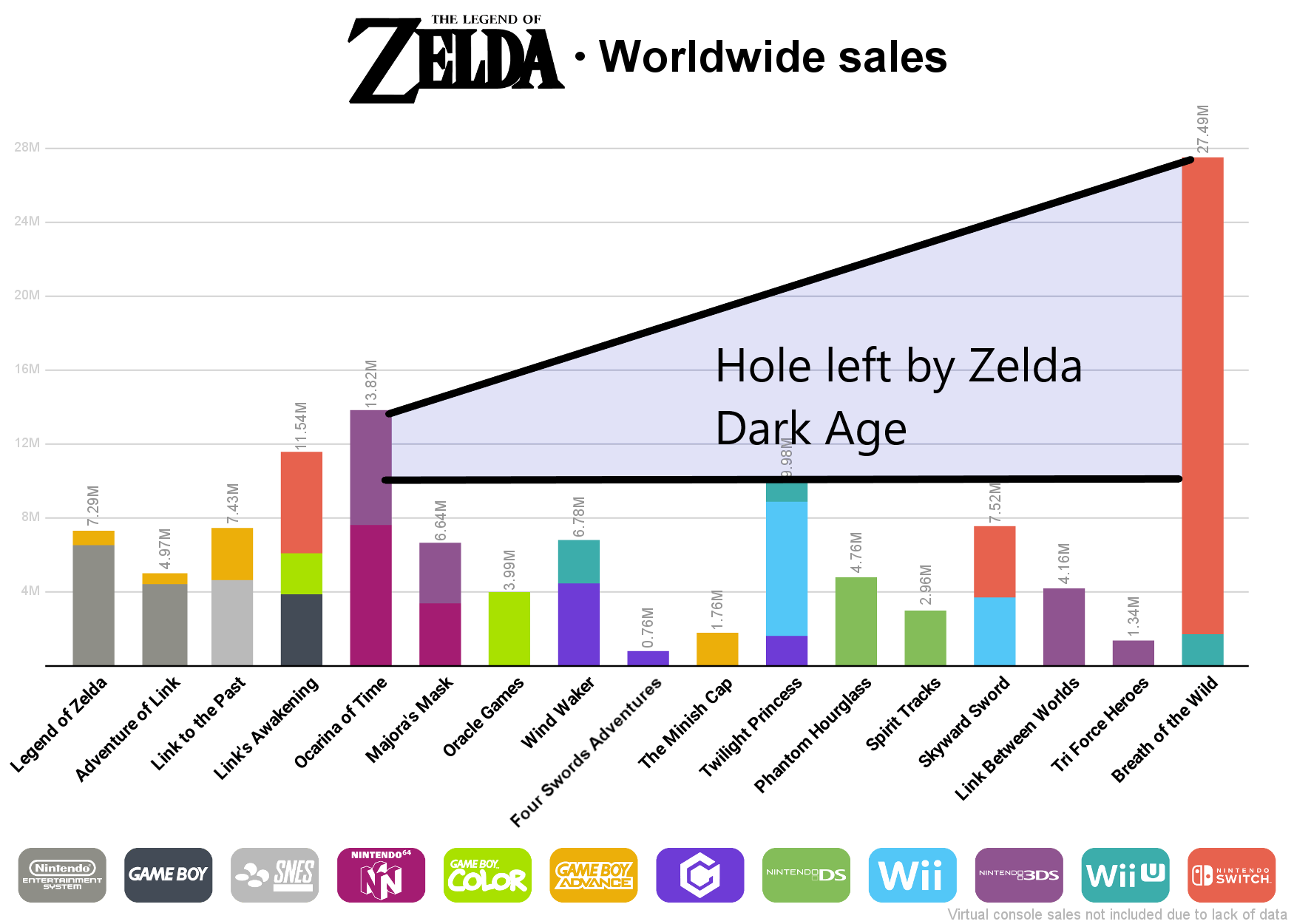 >>730959653>i know ill defend the dark age by using the worst game! Sales (still low) entirely dictated by the promise of real Zelda coming back only to be a huge disappointment which is reflected in the return of fan disinterest in the series with SSs sales. From wind waker to SS was an era when Zelda was no longer special. That should never ever happen. The reason why it did is because Nintendo spent over a decade remaking OoT but worse and wasted multiple gens doing that.