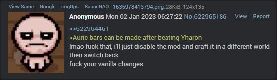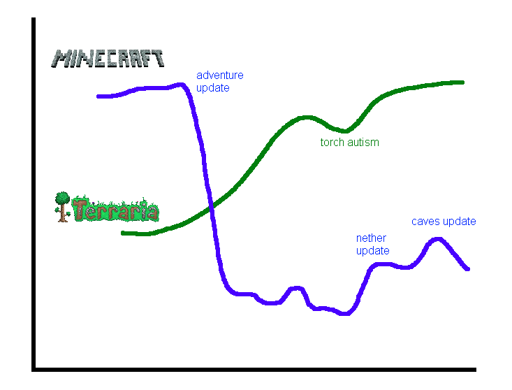 If terraria still played like launch day terraria and if 90% of the things added to terraria did fuck all, things would be different.Minecraft nostalgia is fake for the record, just playing both sides, everyone played with texturepacks back then even if the "dev textures" are less ugly than current day ones