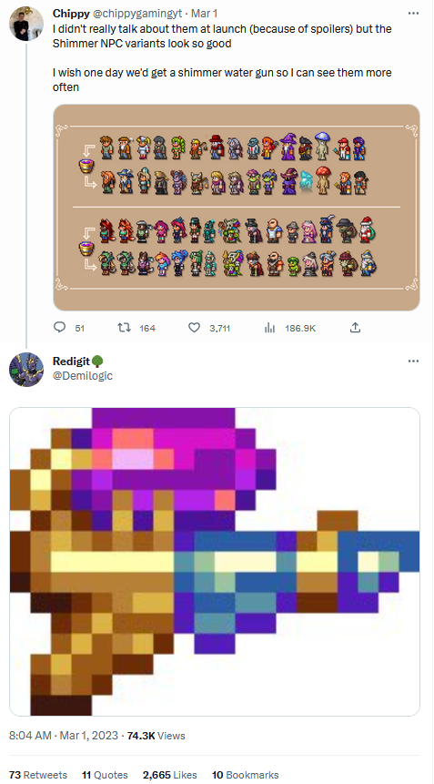 >>731004972>99,9% of player suggestions are ignored by devs.that's just flat out wrong. saying something in an anonymous 4chan post isn't a "player suggestion". if you say something in a place devs can see it, sometimes even just twitter, they might go out of the way for you. we're getting a shimmer watergun in 1.4.5 specifically because someone requested it in a random tweet that wasn't even aimed at the devs. that's 1 of many examples, because if you used their official forums you'd find out that the devs directly talking with players and saying "that's a good idea" is very common.