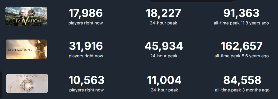 >>731017567That's not how that works at all. People switch over to sequels all the time (as long as they're good). How do you think Sid Meier's Civilization 5 has more players than Sid Meier's Civilization 4, and Sid Meier's Civilization 6 has more players than Sid Meier's Civilization 5? People who are nostalgic for the previous entries still play them, but most people who like the series moved on to the latest non-dogshit game in the series.That is to say that Sid Meier's Civilization 7 is so bad people still prefer VI because it isn't totally wokeslop and has great gameplay, visuals, and music while running well even on low-end PCs.