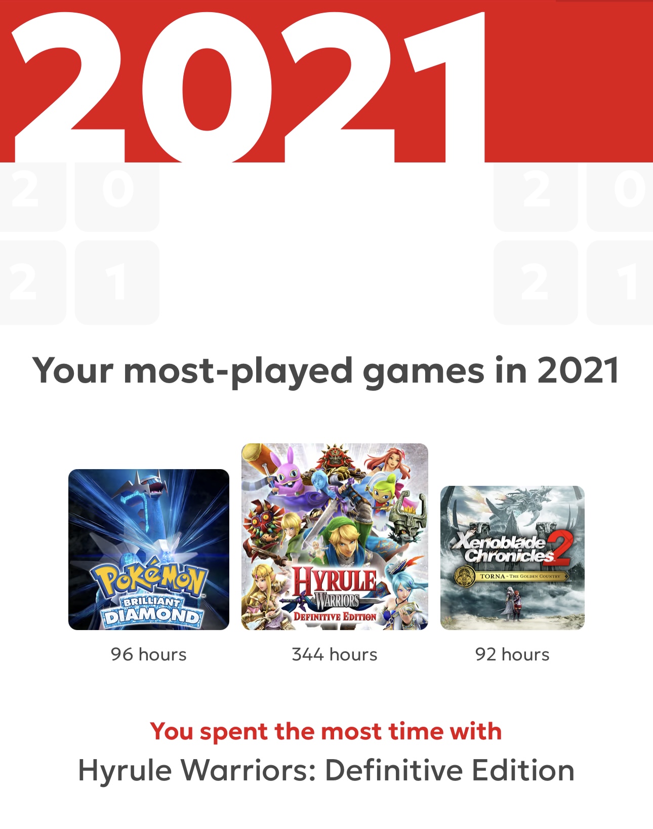 >>731016259>>731016371Didn’t include it but my physical Torna appears in my 2021 stats too, and expansion pass Torna is part of my XC2 playtime so I’d guess that I have at least 130 hours across both versions of Torna Oh and ofc this page doesn’t show my 3DS XC1 and Wii U X stats but I definitely had at least 100+ hours in both back in the day