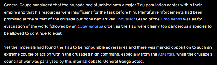 >>731017854says rite here that the ordo xenos was ready to evacuate and nuke a planet to get rid of the tau on it and some astartes were like "...nah not cool"
