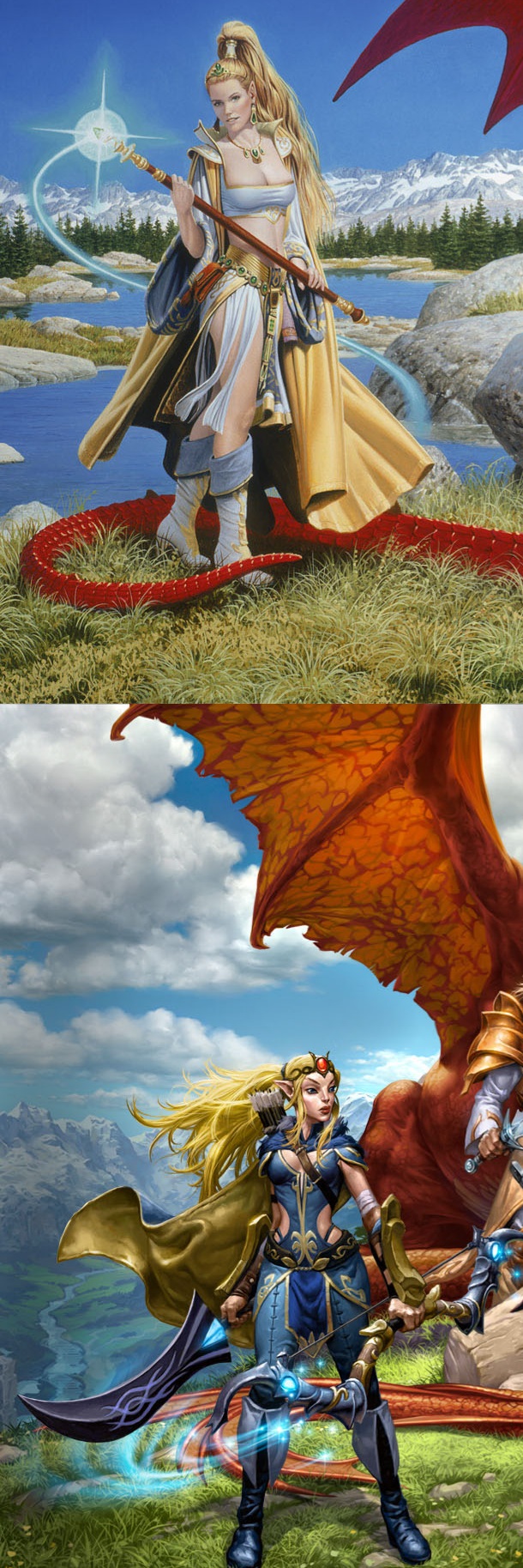 >>730976109>>730976127Its a poetic image really.Lets break it down, bit by bit.>the elven sorceressIn the first picture, she wears white and gold. The white symbolizes purity in many cultures, and gold is obviously regality or royalty, suiting a wizard. She is not wearing armour, she is wearing a loose garment , exotic, yet its not just a bikini. You can tell shes some sort of high sorceress. The dragons bright red tail circles around her feet, like a portal. Her hairstyle- elegant. Her features- nordic or classical european.The second picture has her wearing blue and black. Not a horrible colour combination, but on first glance you cant tell its the same character anymore. Its because shes wearing armour. Not an elegant sorceror's dress, but armour. Like a marvel hero. Its like the tacticool trend for superhero costumes, but for fantasy. Her hairstyle is a basic "let your hair down" situation, and her features are more akin to the botox lips and cheeks of modern instagram models, or more accurately, warcraft women. The weapons "look cool", but they do not make her look as elegant or regal as the previous depiction. Perhaps the pose is a bit better than a woman coyly looking at the view, but its the only positive.>The dragonThe dragon in the first picture is a direct interpretation of the words "winged lizard". It is long and slender, with a narrow mouth, and has bright red scales which could be mistaken for rubies at first glance. The glowing blue eyes contrast against these.The second picture's dragon, is a brute. The dragon's maw is now thick and ogrish, the noble visage marred by exaggerated features which attempt to make the dragon look more organic and less like the magical beast it was, with a muted colour scheme and unglowing eyes. Its tail does not even circle the sorceress's feet, which makes me believe that each of these characters were drawn as separate png images added to a pre-rendered background.Cont.