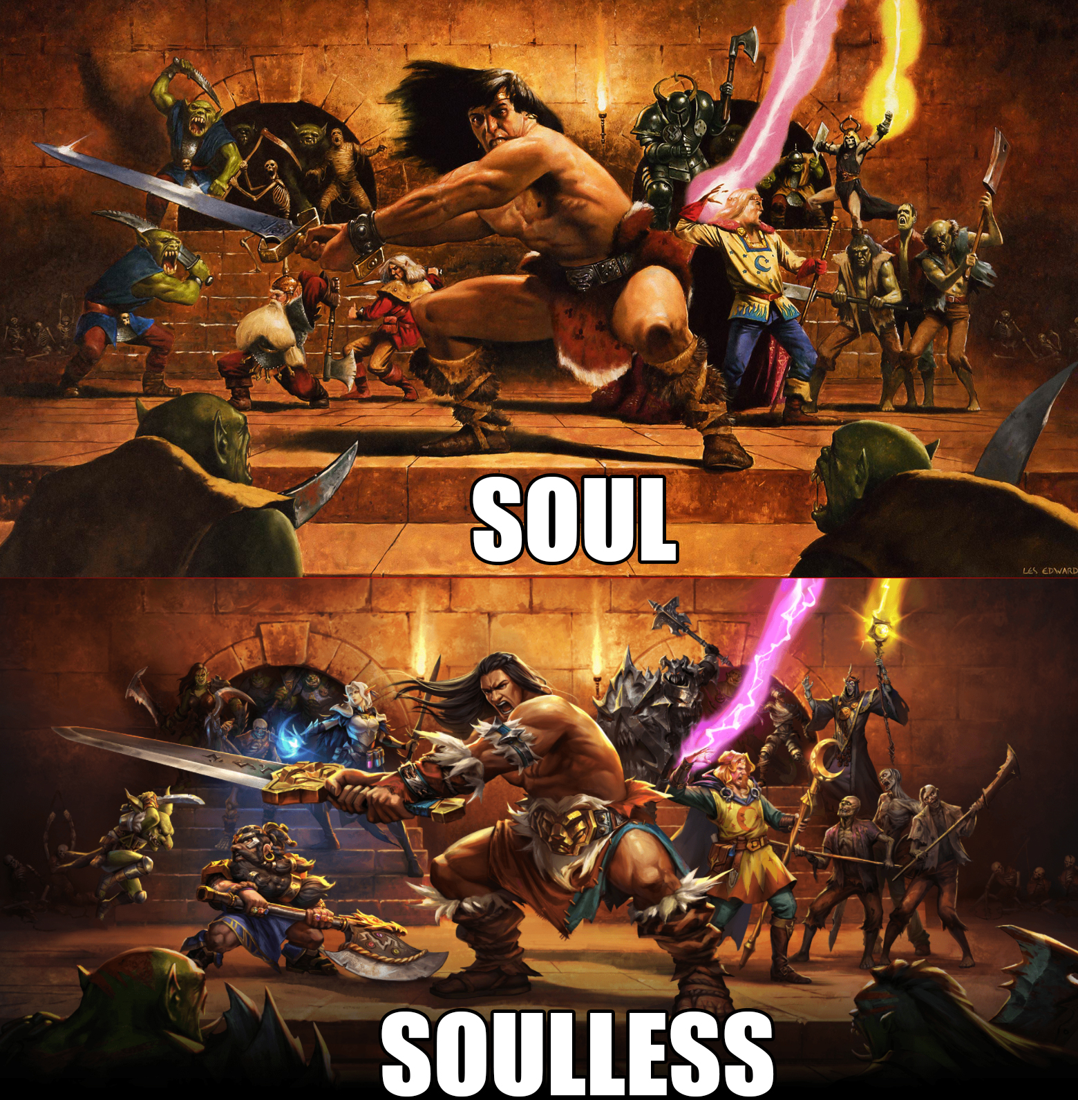 >>730976282>>730976321>>730976353All of this can easily be explained by the fact that the original Everquest art was made by Keith parkinson of all people (best known for his DnD art in the 1980s - the high time of high quality fantasy art; alongside Elmore and Caldwell) and the other one was made by.... who the fuck even knows?It's not even a matter of "le old good le new bad"There is such an insane powergap between those who were traditionally trained and those who got into the field after digital painting took over, it's just fuckin unreal.
